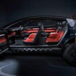 Côté dimensions, les 4,98 m de long, 2,07 m de large et 1,60 m de haut classent l’auto dans le haut du segment premium. Par ailleurs, la plateforme électrique permet de libérer un bel empattement de 2,97 m qui profite directement aux passagers. Pour évoluer sur tous les terrains, les roues sont dotées de segments mobiles : hors-piste, ils s’ouvrent pour améliorer la ventilation ; sur route, ils se ferment pour une aérodynamique optimale. La garde au sol de 208 mm peut quant à elle être augmentée de 40 mm si le terrain l’exige.
