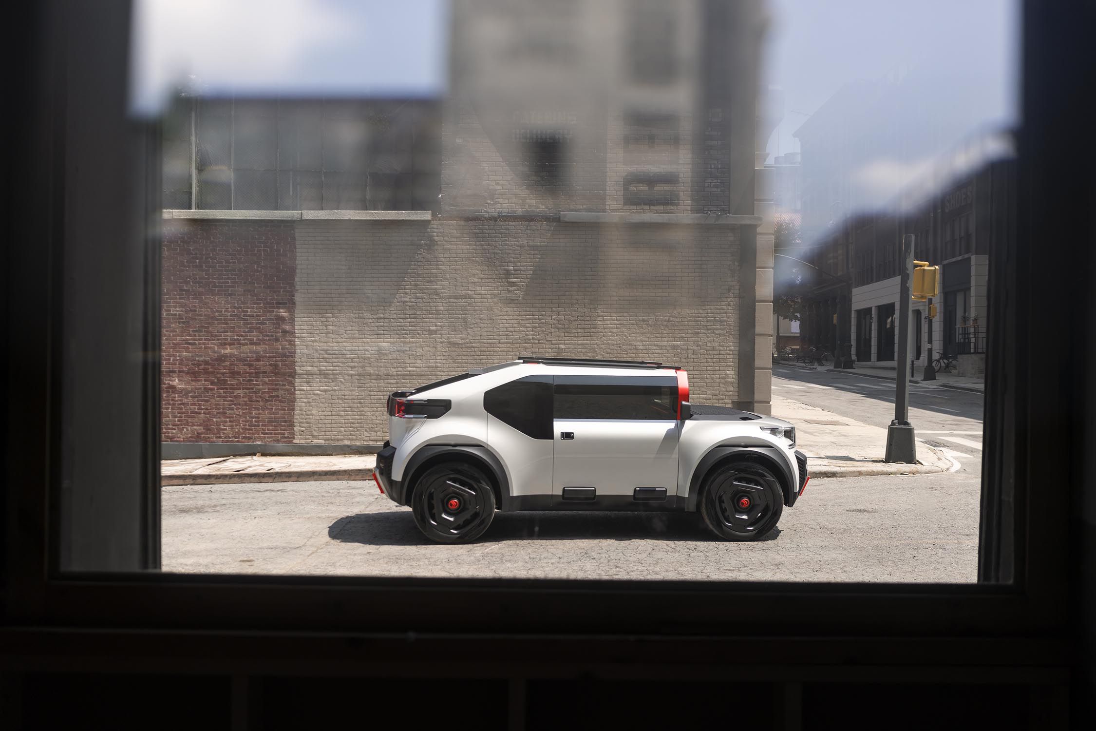 Extérieurement, le concept Oli se présente avec une carrosserie arborant entre autres éléments, le nouveau logo rétro Citroën, un toit et un capot composés d’une structure alvéolaire en carton à la fois légère et plus résistante que l’acier, ainsi qu’un pare-brise avec un angle de 90° pour repousser les rayons du soleil. Ce concept Citroën Oli intègre également une benne de chargement à l’arrière, et des rails pour y fixer accessoires et chargement. Les pneumatiques (Eagle GO) qui équipent ce concept, sont quant à eux conçus avec Goodyear.