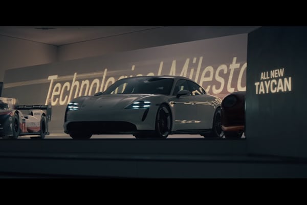 Un spot des plus spectaculaires, dans lequel le nouvelle berline 100 % électrique de Porsche, la Taycan, tient la vedette aux côtés de plusieurs icônes de la marque allemande tout droit sorties de son musée officiel de Stuttgart.