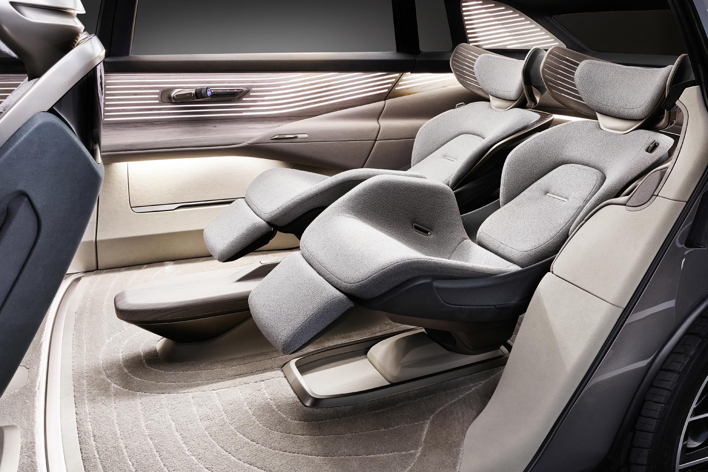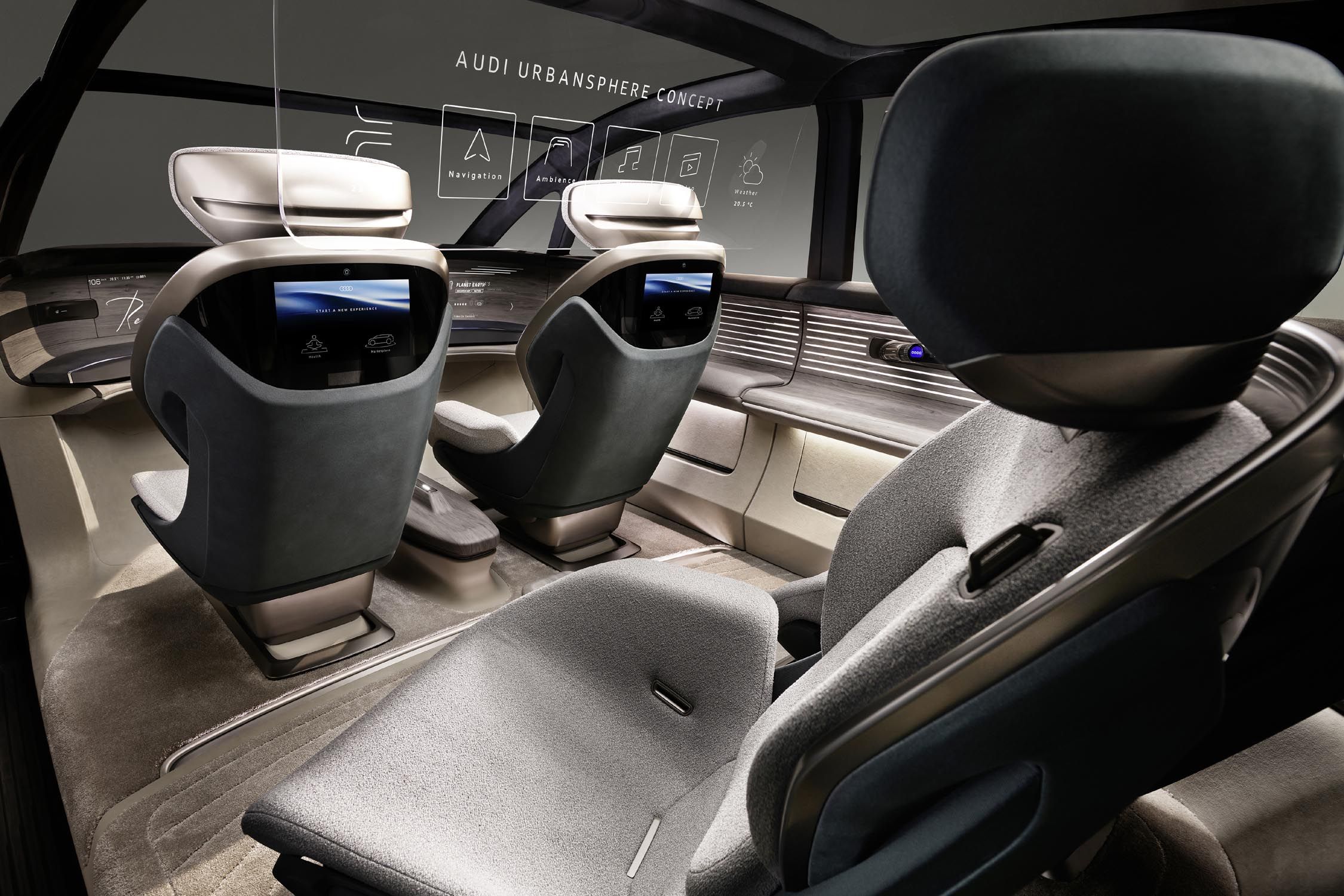Le concept urbansphere auquel on accède via des portes à ouverture antagonistes, propose aussi et surtout un habitacle spacieux (le plus grand proposé à ce jour sur un modèle Audi) pouvant accueillir quatre passagers. Cet habitacle doté de sièges individuels, et habillé de matériaux durables et de qualité, est équipé de plusieurs écrans permettant à chaque passager de voyager dans sa propre sphère s’il le désire. Et c’est tout l’intérêt de ce concept urbansphere, qui offre un espace luxueux doté de toutes les technologies et applications disponibles, pour garantir le voyage le plus confortable et le plus relaxant possible.