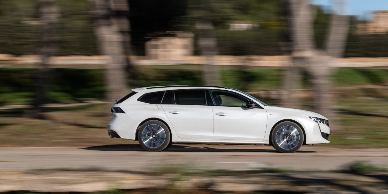 Selon Peugeot, la 508 Hybrid 225 e-EAT8 GT est capable d’effectuer jusqu’à 44 km (cycle WLTP) dans ce mode avant d’épuiser la batterie et de se retrouver en mode hybride classique. Hélas, lors de notre essai dans la région de Sitges, en Catalogne, nous n’avons pas réussi à atteindre les 30 km en 100 % électrique, en dépit d’une conduite douce et de températures clémentes. On ne va pas se mentir : c’est une déception, les modèles hybrides rechargeables les plus récents nous ayant habitué à nettement dépasser les 30 km avec une seule charge. Heureusement, l’appétit reste modéré une fois la batterie vide : environ 7 l/100 km. De la même manière, la puissance combinée annoncée de 225 ch se traduit en réalité par des performances assez quelconques. La 508 SW Hybride offre en effet des accélérations comparables à la version PureTech 180 ch, une (relative) indolence à laquelle le surplus pondéral de 315 kg n’est évidemment pas étranger. Reste qu’avec des caractéristiques comparables, la Volkswagen Passat SW GTE se montre plus véloce. Là où l’allemande ne peut lutter, en revanche, c’est au chapitre des qualités routières. Car la Peugeot parvient à faire oublier son embonpoint ! Direction précise, train avant incisif, amortissement efficace, châssis très équilibré : on peine à croire que ce break hybride avoue 1 745 kg sur la balance. Même le freinage, habituellement un point délicat sur les hybrides, est progressif et facile à doser. Le tout sans compromis sur le confort, qui reste excellent en toutes circonstances, d’autant que cette finition GT dispose d’un amortissement piloté.