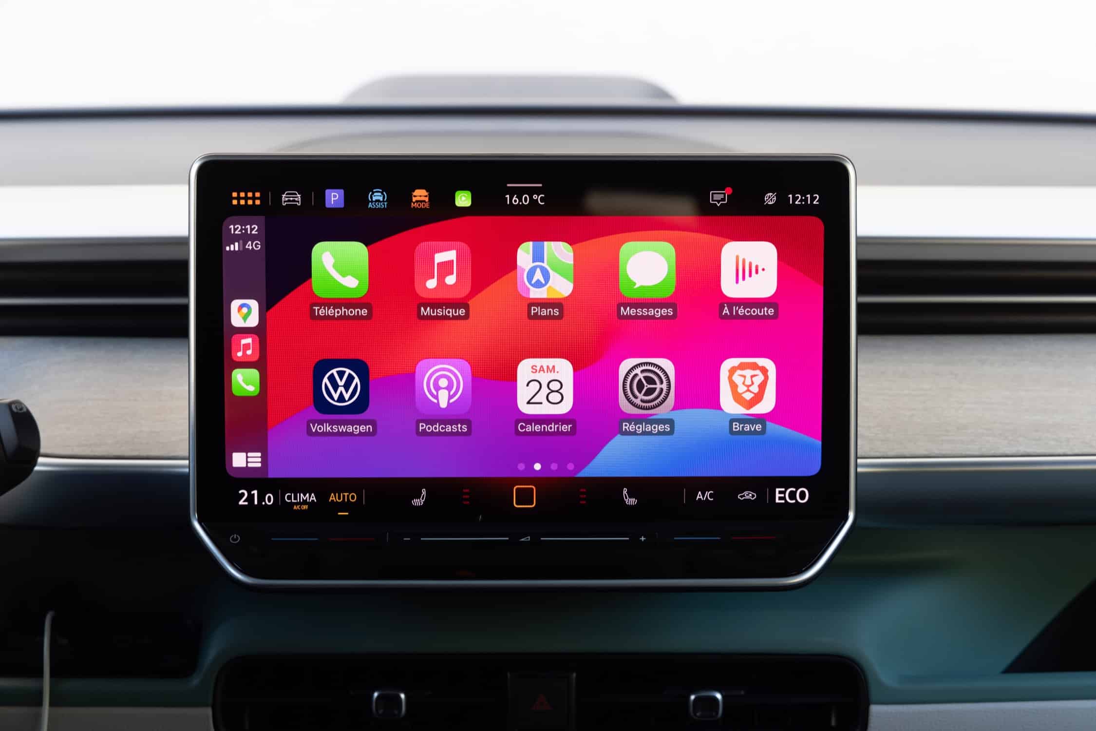 À l’intérieur, l’ambiance est plus sobre que dans les versions Pro, avec des tons sombres et des touches sportives, comme les surpiqûres rouges sur les sièges. La planche de bord intègre un écran central de 12,9 pouces, regroupant le système multimédia simplifié et un assistant vocal activé par la commande « Bonjour ID ». Les commandes tactiles restent perfectibles, on continue souvent à tâtonner pour les utiliser pendant la conduite.