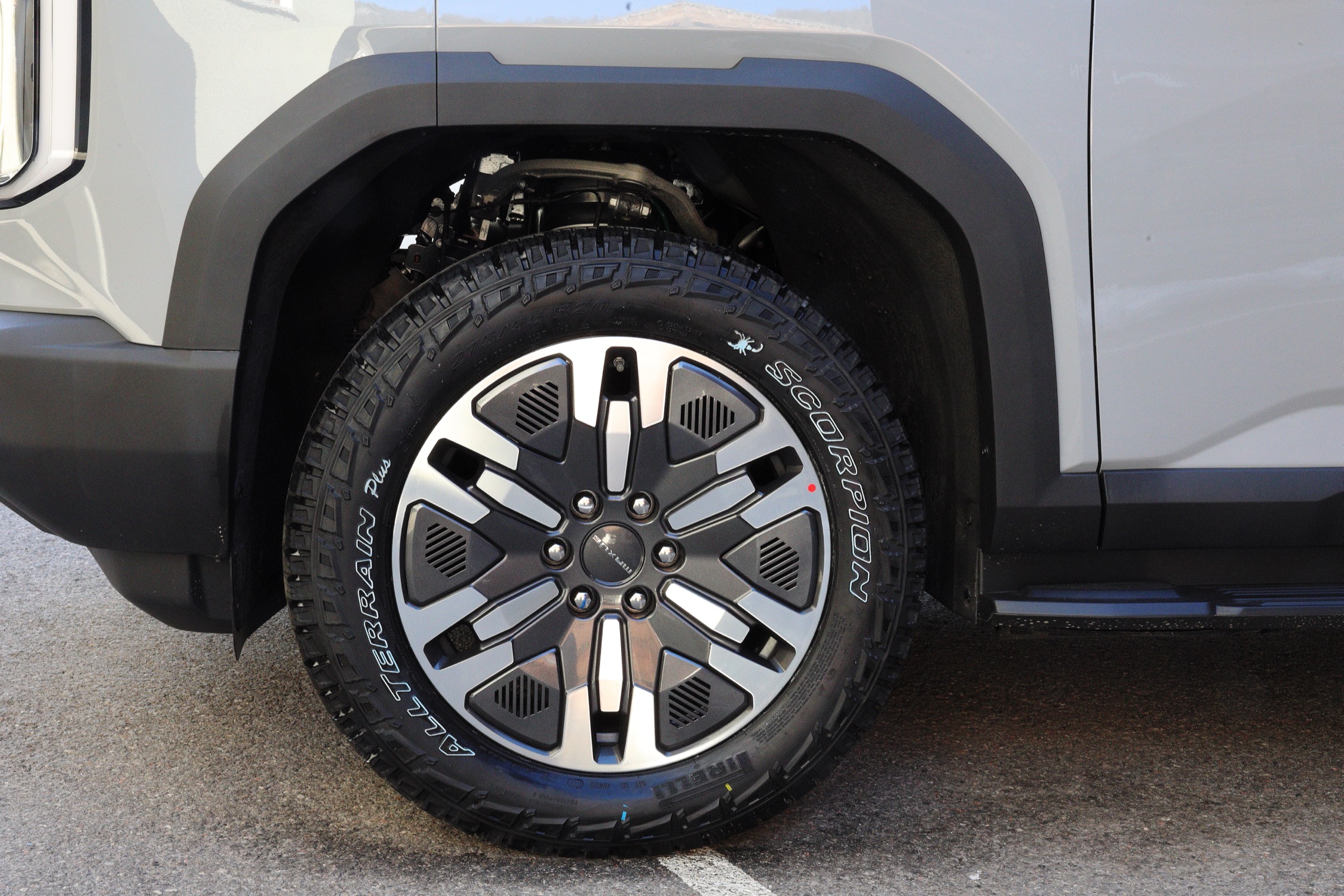 Pour la partie électrique, le eTerron 9 est équipé d’une batterie de 102,2 kWh qui lui permet de revendiquer une autonomie mixte WLTP de 430 km. Lors de notre essai, cette autonomie s’est avérée plus proche des 350 km. Sur une borne DC, la charge rapide de 20 à 80 % sur une borne s’effectue en environ 40 minutes, ce qui reste correct pour un véhicule de ce type. Grâce à la technologie V2L, il est également possible d’alimenter des appareils électriques jusqu’à 2 kW via des prises 220 V intégrées, mais jusqu’à 6 kW en puisant directement dans la batterie de traction grâce à un pistolet de décharge.
