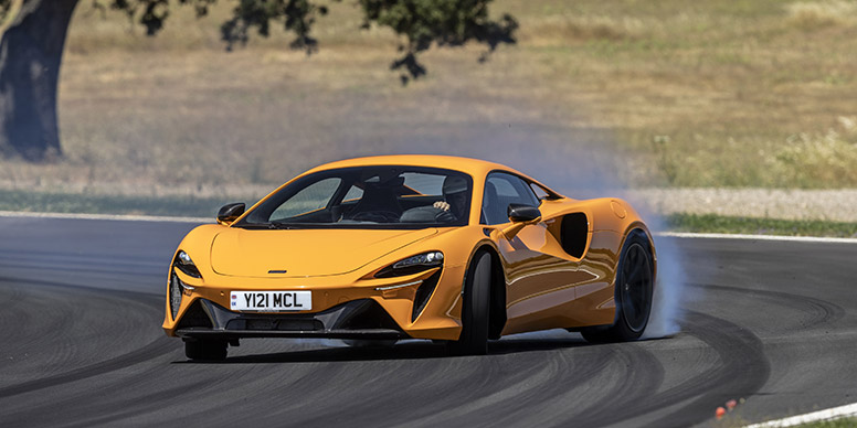 Lancée sur circuit, l’Artura offre les mêmes sensations avec un très haut niveau de motricité et de grip. Sous-vireuse à la limite, l’Anglaise met en confiance et invite naturellement à réduire et supprimer les aides à la conduite, même sur un tracé aussi exigeant que la piste d’Ascari. Très stable et verrouillée à notre rythme, elle nous a donné l’impression de pouvoir aller beaucoup plus loin dans l’attaque. Malheureusement, nous n’en verrons pas plus : au moment de notre seconde série de tours où nous devions pousser davantage et supprimer les aides à la conduite, un incident en piste sur un autre exemplaire nous a obligé à rejoindre la voie des stands. Dommage, car l’Artura semblait douée pour chasser le chrono sur circuit. Les ingénieurs de la marque nous assurent d’ailleurs que les batteries du moteur électrique sont conçues pour tenir 10 tours d’affilée d’un grand circuit comme celui de Nardo avant de commencer à perdre en performance. Capable de tenir sur un track-day complet selon les communicants de la marque, l’Artura n’a en tout cas jamais donné l’impression de réduire ses performances pendant notre essai même sur la route une fois les batteries vides (elles se rechargent toutes seules via le frein moteur). Notez qu’un problème de surchauffe sur l’un des modèles d’essai pendant notre sessions sur circuit, qui a entraîné l’arrêt des essais, serait dû à un petit souci lié aux exemplaires de pré-série. McLaren promet qu’ils ne concerneront pas les autos vendues aux clients (garanties 5 ans ou 75 000 kilomètres).
