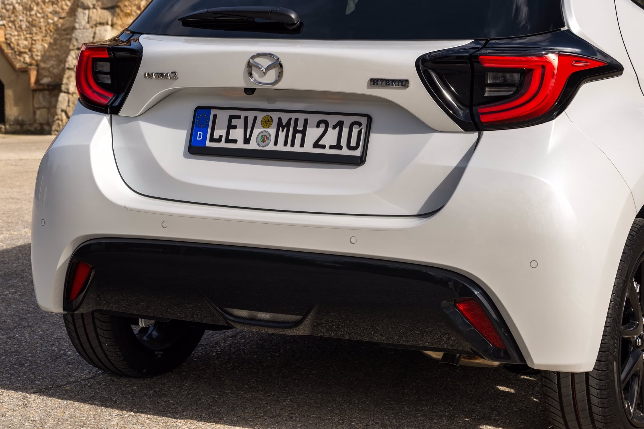 Sur les flancs, Mazda se différencie par le choix des jantes, tandis qu’à l’arrière, la différenciation n’est guère favorisée que par le ton carrosserie du bandeau placé entre les deux feux. Cela étant dit, la Yaris étant plutôt réussie esthétiquement, aucune de ces petites adaptations portées par Mazda ne vient nuire à cette citadine de 3,94 m.